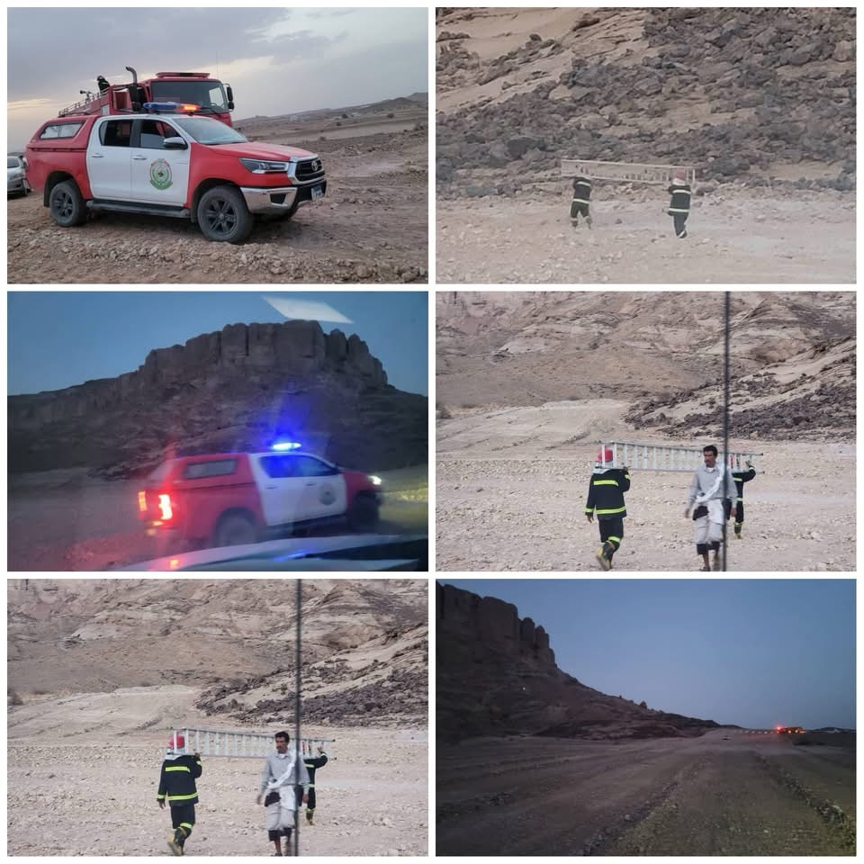 الدفاع المدني بشبوة يستجيب لاستغاثة ثلاثة شبان عالقين في جبل شرقي عتق ويستنفر جهود الإنقاذ