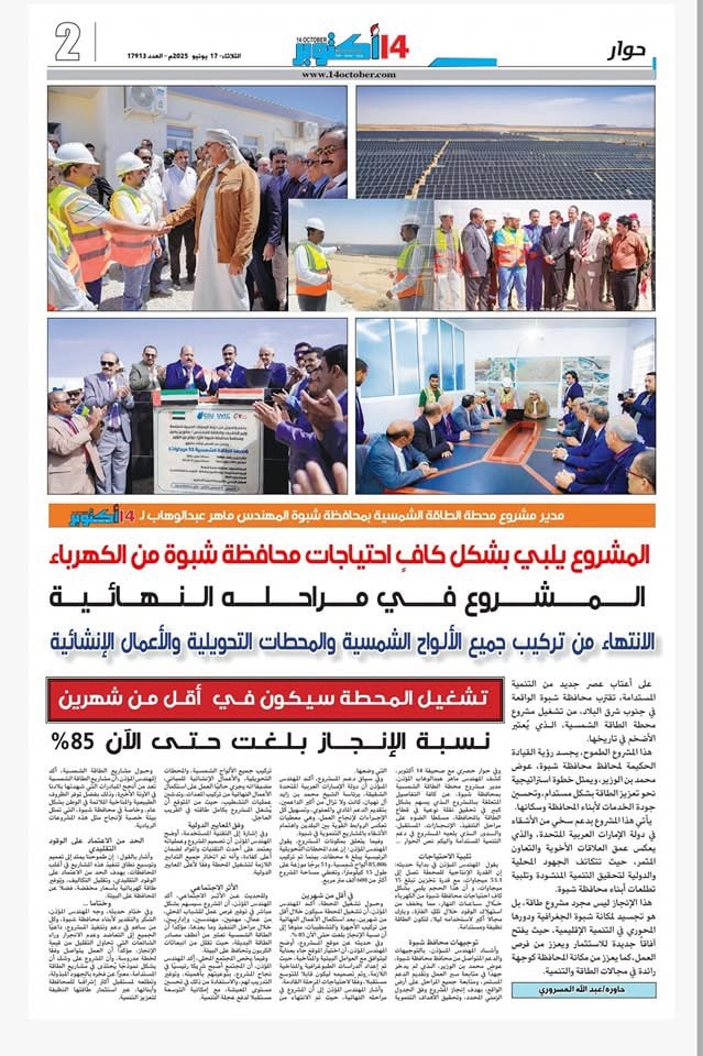 مدير مشروع محطة الطاقة الشمسية بشبوة: الانتهاء من تركيب جميع الألواح الشمسية والمحطات التحويلية والأعمال الإنشائية.