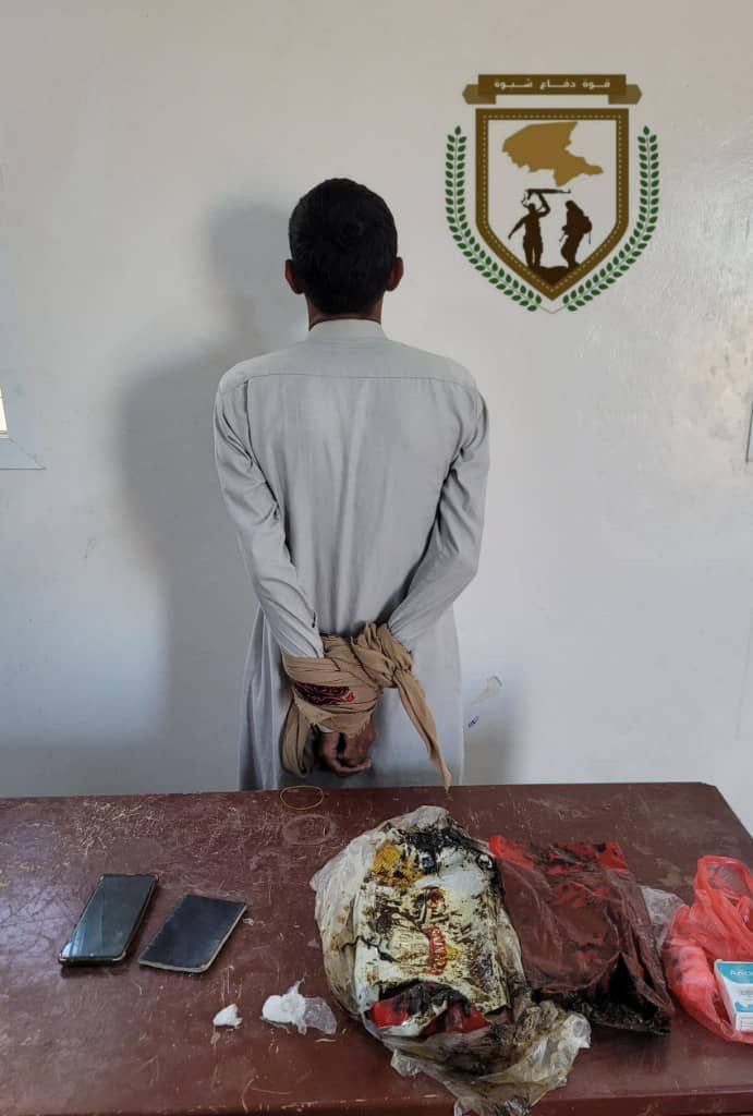 قوات دفاع شبوة تحبط محاولة تهريب 2 كيلو من مادة الحشيش المخدر وكمية من الشبو كانت في طريقها لمدينة عتق