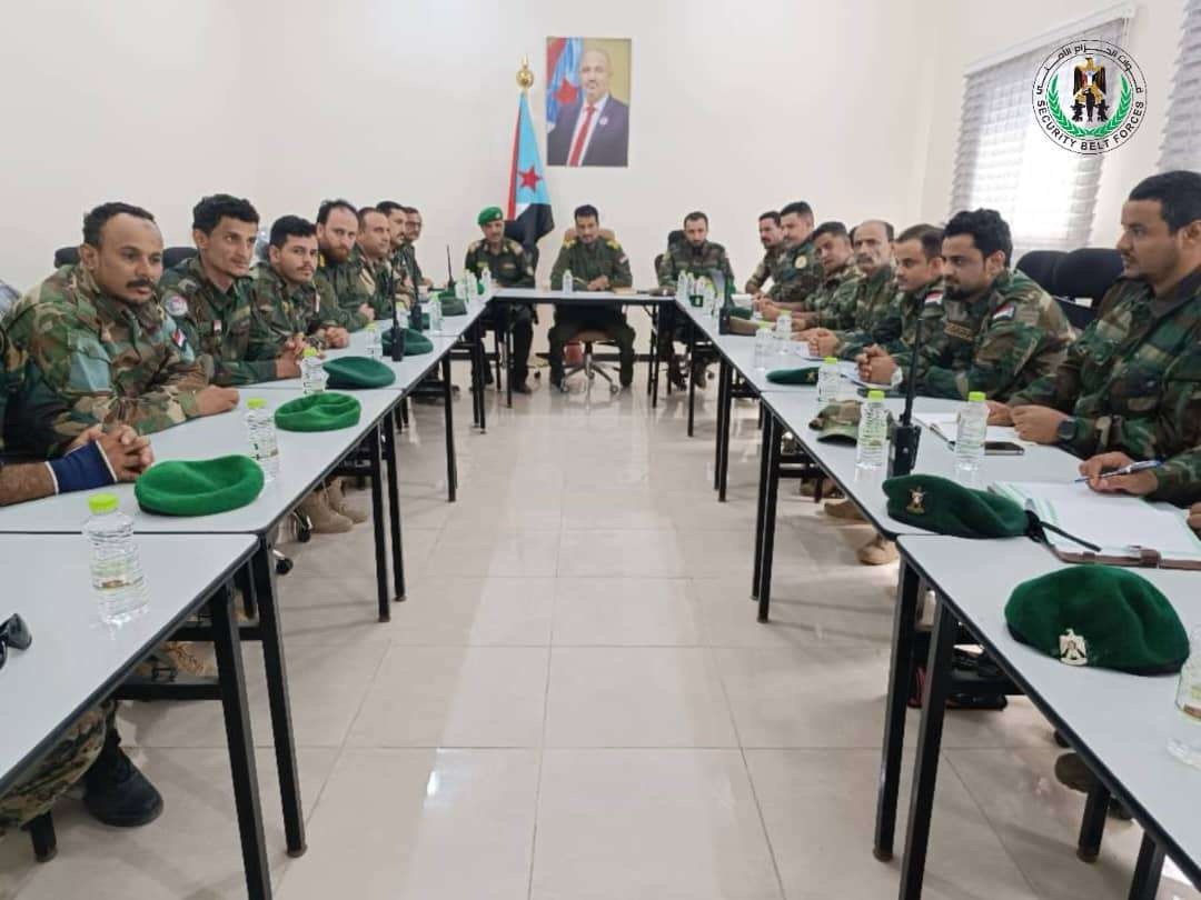 أركان قوات الحزام الأمني يترأس اجتماعاً أمنياً لقادة القطاعات ومدراء الإدارات في قوات حزام العاصمة عدن