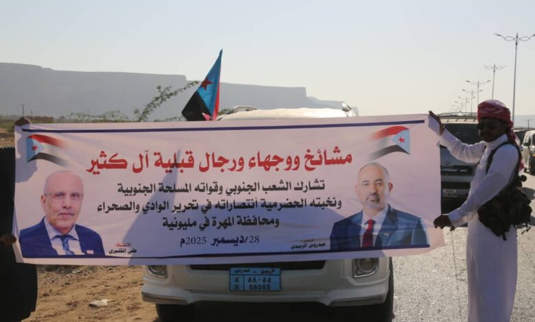 مشائخ ووجهاء قبائل آل كثير يعلنون وقوفهم الكامل خلف الرئيس الزُبيدي ويشاركون الجماهير الجنوبية احتفالات الانتصارات التاريخية