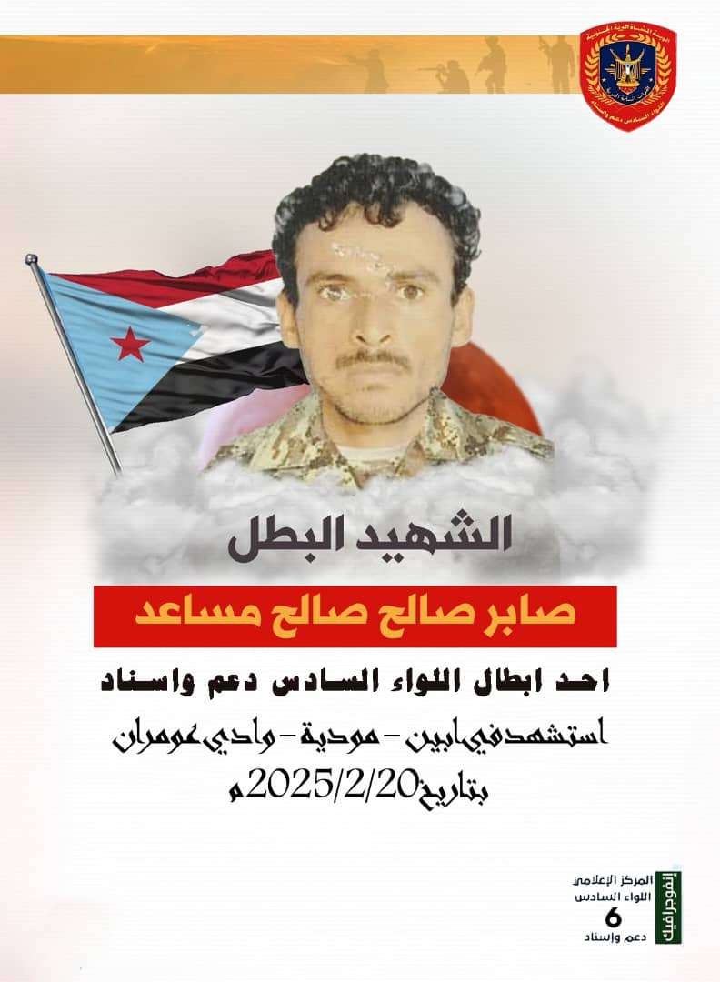 قائد اللواء السادس دعم وإسناد يُنعي استشهاد البطل صابر الأزرقي في وادي عومران بأبين