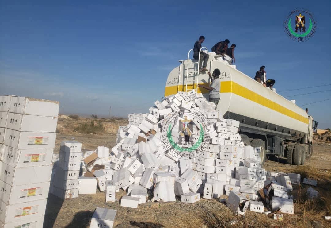 قوات الحزام الأمني بيافع تضبط شحنة أدوية ومبيدات سامة مهربة داخل صهريج زيت خام
