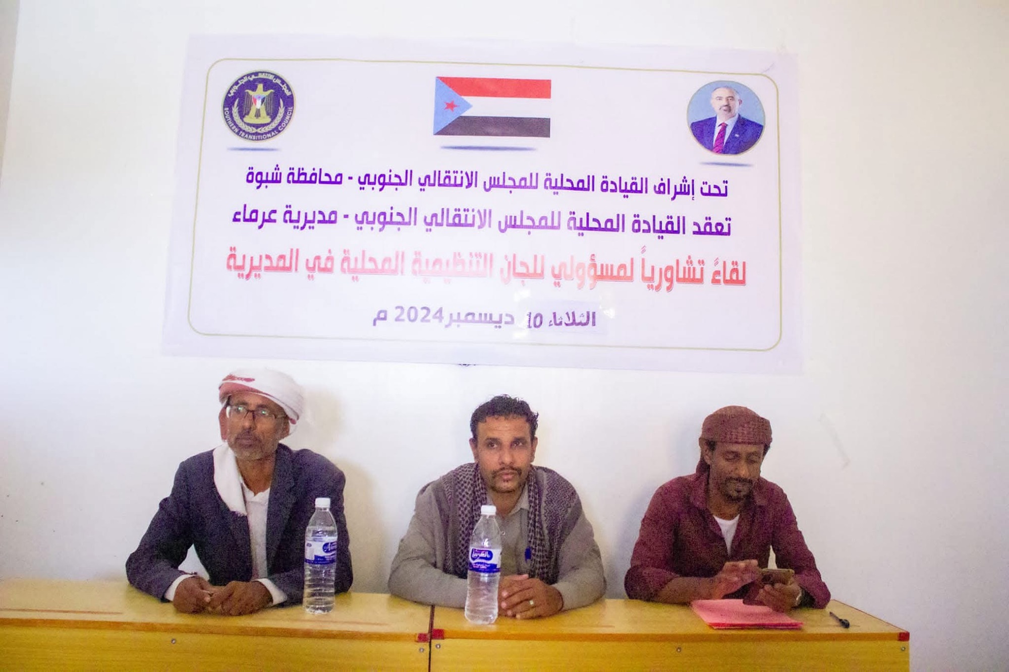انتقالي عرماء ينظم لقاءً تشاوريًا لمسؤولي الشؤون التنظيمية باللجان المحلية بمراكز المديرية