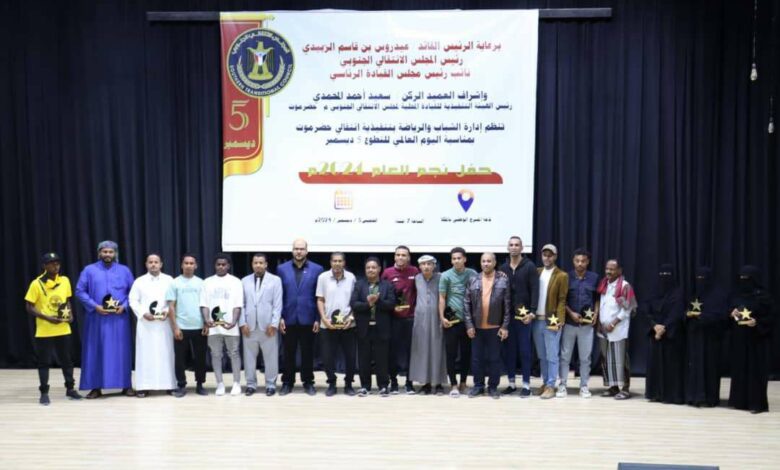 انتقالي حضرموت ينظم حفلاً تكريمياً وفنياً لنجم العام 2024 بمناسبة اليوم العالمي للتطوع بالمكلا