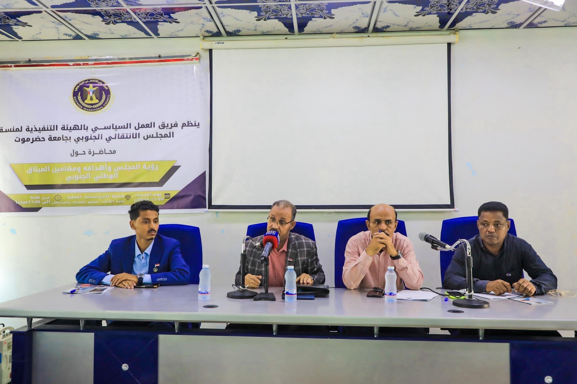 منسقية انتقالي جامعة حضرموت تنظم محاضرة بعنوان “رؤية المجلس وأهدافه ومضامين الميثاق الوطني الجنوبي”