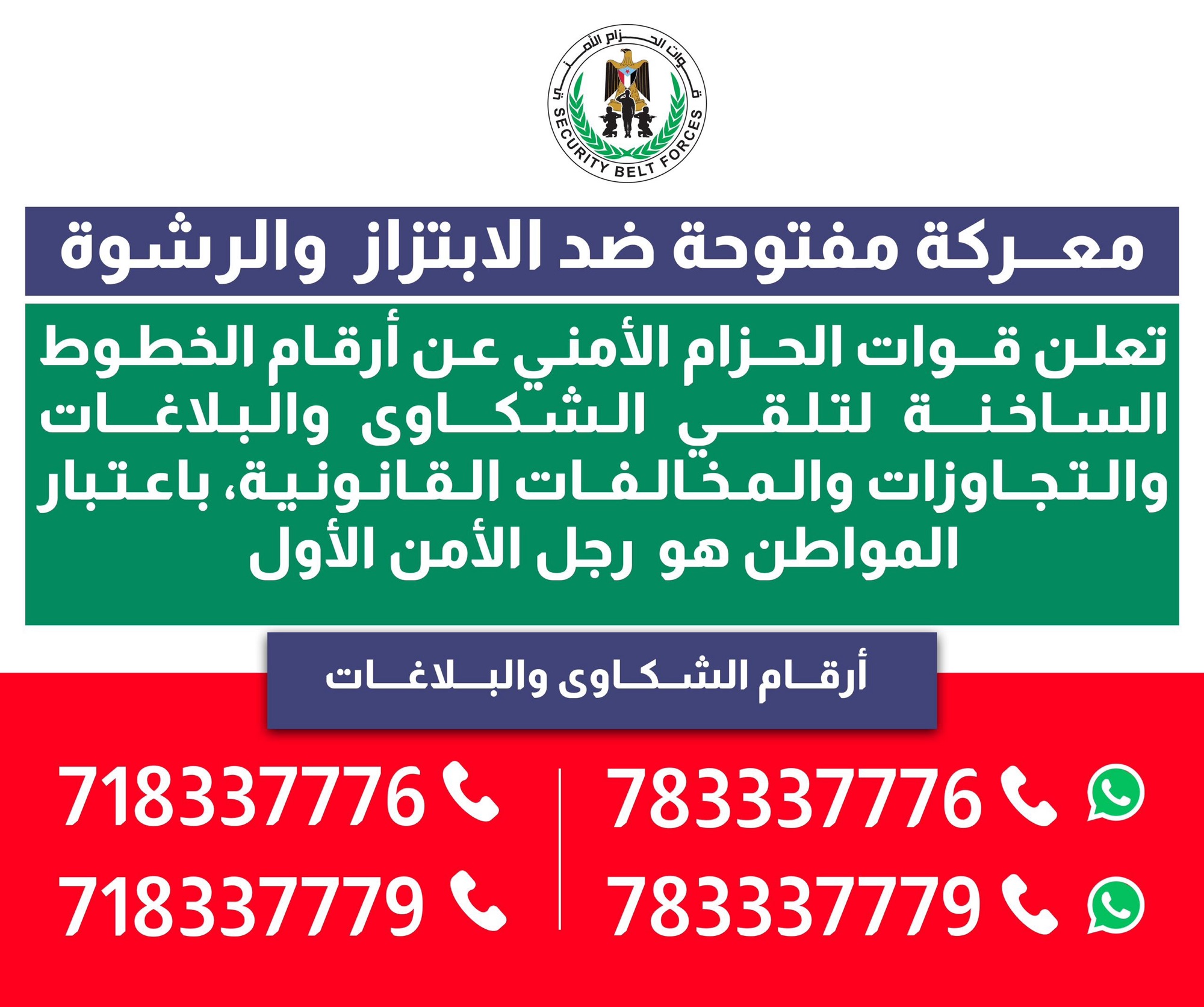 تحت شعار معركة مفتوحة ضد الابتزاز والرشوة..الحزام الأمني يعلن أرقام الخطوط الساخنة لتلقي شكاوي المخالفات القانونية والابتزاز والرشوة