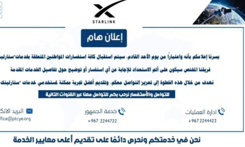 إعلان هام من مؤسسة الإتصالات بشأن خدمة ستارلينك في العاصمة عدن