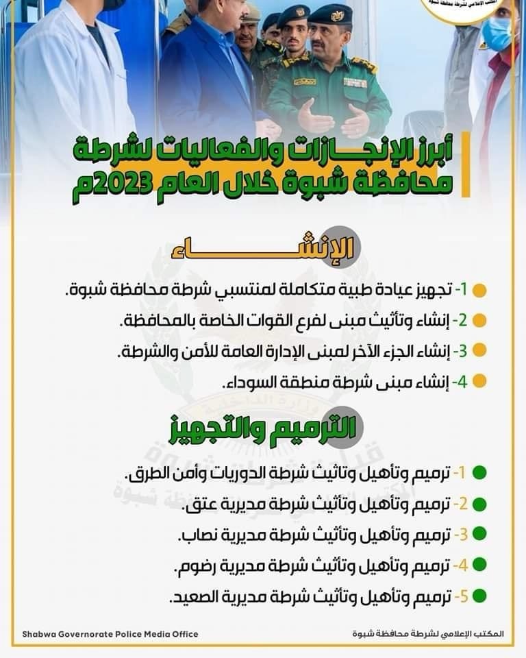 نتائج جهود المحافظ بن الوزير، ودعم الأشقاء في الإمارات لمشروع تأهيل المنظومة الأمنية في محافظة شبوة