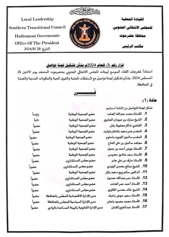انتقالي حضرموت يشكل لجنة لتوحيد الصف وانتزاع حقوق المحافظة ودعم جهود قوات النخبة الحضرمية